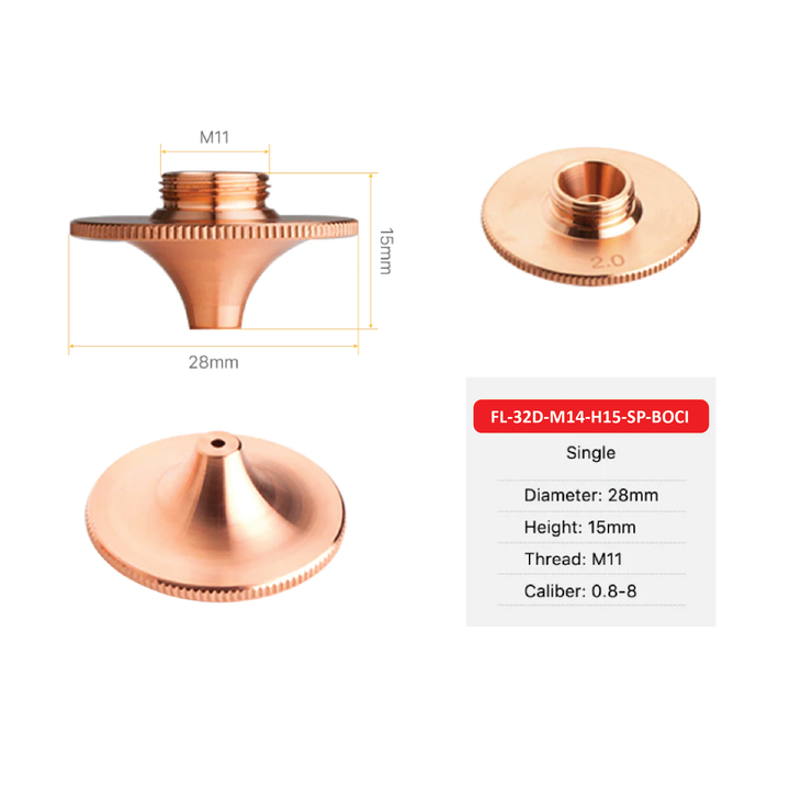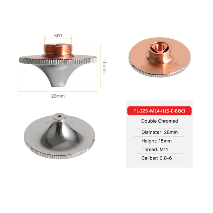 Genuine BOCI Fiber Nozzle 28mm Diameter, M11, 15mm Height. Available in E-type (Double High flow) and SP-type (stepped single)